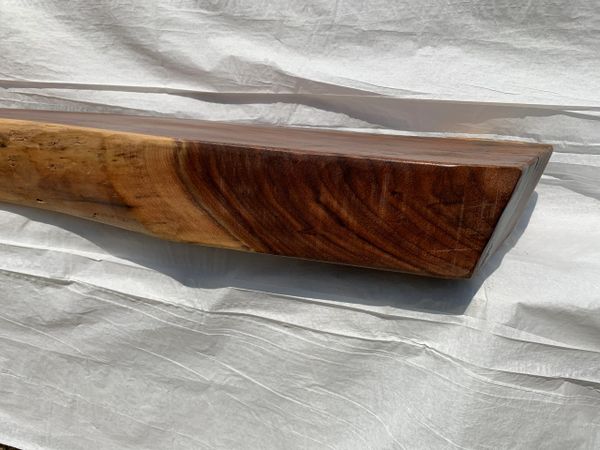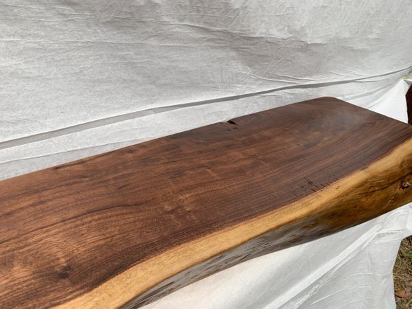 Installed and finished walnut natural mantel live edge fireplace mantel. Made out of solid walnut wood with a mahogany finish, this option is available in three different lengths.